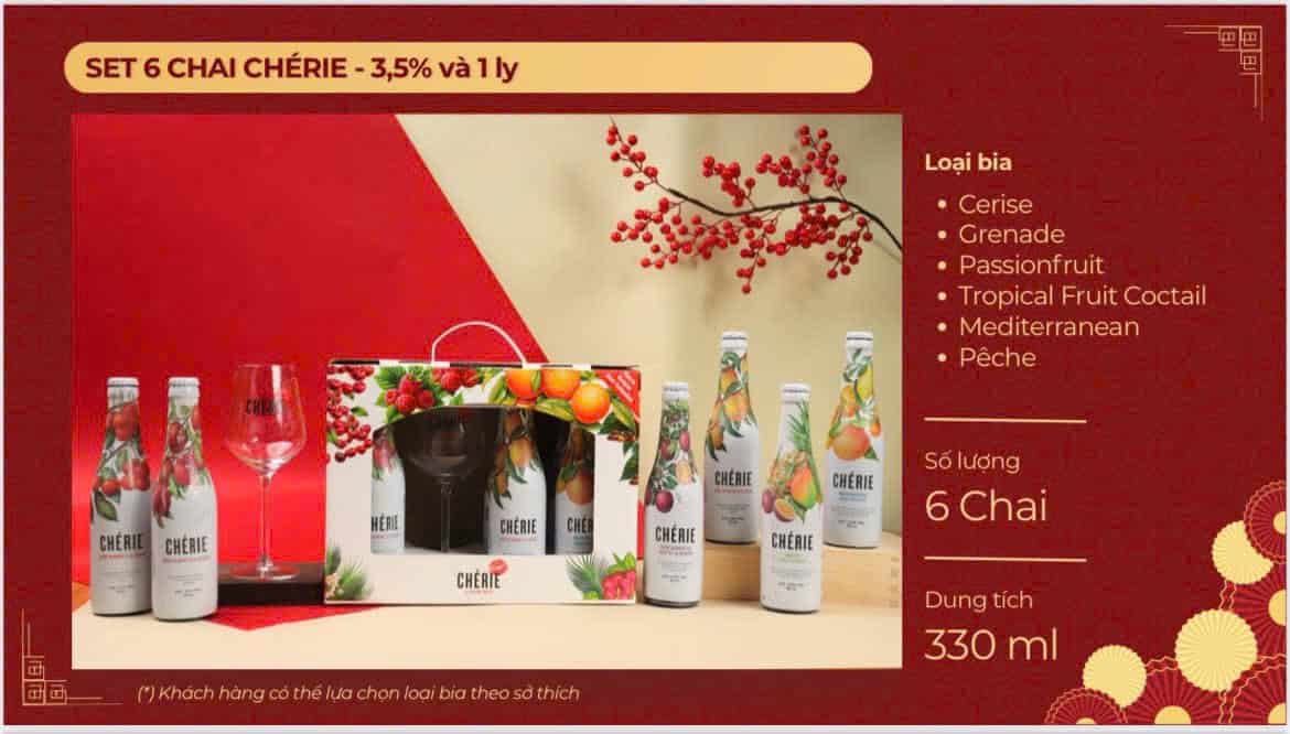 • Tên sản phẩm HỘP QUÀ 6 CHAI BIA CHERIE HOA QUẢ + 1 LY